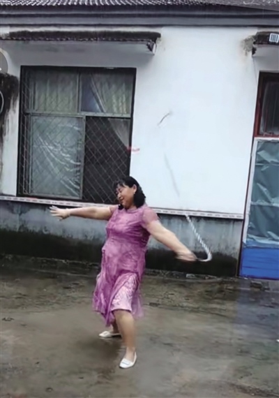 “清水河”大媽與抖音的相遇是在3年前。當時,遭遇了親人離世的她悲傷難抑,為了讓她分散注意力,她的女兒幫她下載了抖音。此后,大媽時常刷刷抖音,也慢慢從中悟出了一個道理,就是生活中不如意十之八九,人要好好活著,要快樂地活著。很快,大媽就從悲傷中走了出來,也學著在抖音上拍攝自己的日常。雖然起初視頻點贊量不多,但能記錄下生活的點滴足以讓她格外開心。一直到了去年9月份,大媽無意之中發(fā)布了一條雨中甩鞭子的視頻。視頻中,大媽身著一襲紅裙,有節(jié)奏地甩起了十幾斤重的鐵制麒麟鞭?!芭距⑴距?、啪嗒……”聲聲響亮、威風凜凜。就是這條視頻讓她一夜爆紅。此后短短幾天,這條視頻的點贊量就突破了200萬,一時間,抖音上還掀起了一陣和大媽合拍的熱潮。