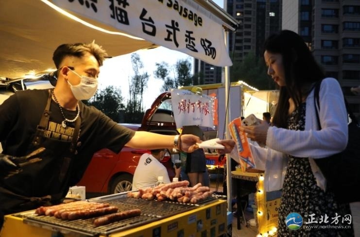 人間煙火氣,最撫凡人心。雖然已是21時(shí)許,但是后備廂集市依然人頭攢動(dòng),熱鬧非凡,叫賣聲不絕于耳。一家烤腸攤位前,攤主郭浩楠一邊招呼食客,一邊拿著夾子不緊不慢地翻動(dòng)著烤架上的烤腸,烤好后拿竹簽一穿,伴著滋滋作響的聲音,紅光透亮的烤腸瞬間香氣四溢?!耙呀?jīng)參加了好幾場(chǎng)了,一晚上能售出近百根烤腸,不過(guò)我的初衷不是為了賺錢,就是想把自己鐘情的美食分享給大家?!惫崎f(shuō)。