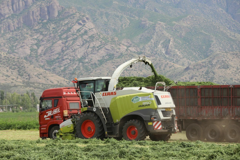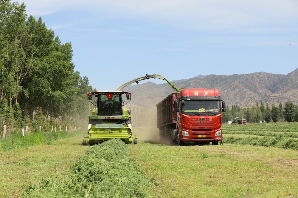 紫花苜蓿是多年生草本植物,因其產(chǎn)量高、生長(zhǎng)周期短、再生能力強(qiáng),是優(yōu)質(zhì)的高蛋白牧草。當(dāng)天,收割令一下,3臺(tái)大型收割機(jī)械同時(shí)開動(dòng),如同巨輪駛?cè)刖G色海洋,場(chǎng)面壯觀。割下的紫花苜蓿就地晾曬,待苜蓿中水分含量下降后,再進(jìn)行粉碎、裹包,然后進(jìn)行貯存,提供給牧場(chǎng)作為青貯飼料。