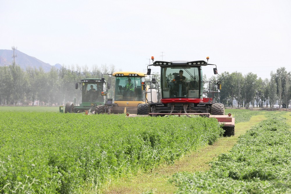 6月4日上午,位于敕勒川生態(tài)綠廊內(nèi)的呼和浩特市土默特左旗國家農(nóng)業(yè)示范區(qū)(兵州亥)苜?;?200畝紫花苜蓿頭茬開鐮收割。