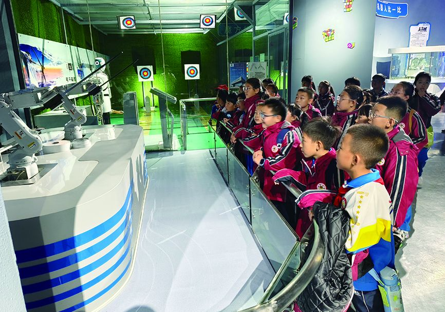 活動當天,學生們分組穿梭于科技館各主題展廳,在互動探索中感受科學的“活態(tài)”魅力?!吨悄芸臻g展》里,靈活運轉(zhuǎn)的機器人與炫酷的汽車模型引得孩子們駐足圍觀,通過觀察與操作,他們直觀觸摸到了人工智能與機械工程的奇妙;《金雕飛起的地方——烏蘭察布市鳥類攝影科普展》中,栩栩如生的鳥類標本與生動的小課堂結(jié)合,讓學生們既領(lǐng)略了家鄉(xiāng)生態(tài)之美,又學習了生物多樣性保護知識;《科學探索廳》的聲、光、電、磁實驗區(qū)更是“人氣王”,孩子們親手操作裝置,見證靜電吸附、光的折射等現(xiàn)象,在動手實踐中驗證課本里的科學原理;《中國古代科技展》則通過古代工匠的智慧結(jié)晶——司南、地動儀等復(fù)原模型,將“四大發(fā)明”的故事“娓娓道來”,讓傳統(tǒng)文化與科學精神在孩子們心中交織。除了靜態(tài)展品,科技館的特效影院成為另一塊“沉浸式課堂”。4D影院的震動、吹風特效與球幕影院的宏大視角,將宇宙演化、自然奇觀、科技突破等內(nèi)容直觀呈現(xiàn),抽象的科學原理變得可感可觸?!霸瓉砗诙次e物質(zhì)的過程這么震撼!”一名學生在觀看球幕影片后興奮地說,“現(xiàn)在我對天文知識的興趣更濃了!”