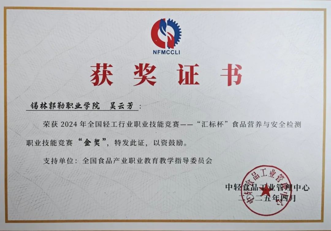 2025年4月21日,由中國輕工業(yè)聯(lián)合會、中輕食品工業(yè)管理中心、全國食品產(chǎn)業(yè)職業(yè)教育教學指導委員會等聯(lián)合舉辦的2024年全國輕工行業(yè)職業(yè)技能競賽——“匯標杯”食品營養(yǎng)與安全檢測職業(yè)技能競賽總決賽在廣州圓滿落幕。錫林郭勒職業(yè)學院食品檢測中心總工程師吳云芳同志榮獲金獎?! ?/p>