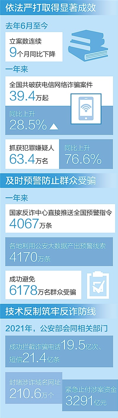 據(jù)介紹,全國公安機(jī)關(guān)深入開展“云劍”“長城”“斷卡”“斷流”“5·10”等專項(xiàng)行動,先后組織開展150次全國集群戰(zhàn)役。一年來,共破獲電信網(wǎng)絡(luò)詐騙案件39.4萬起,抓獲犯罪嫌疑人63.4萬名,同比分別上升28.5%和76.6%。根據(jù)最新統(tǒng)計(jì),電信網(wǎng)絡(luò)詐騙立案數(shù)連續(xù)9個(gè)月同比下降,打擊治理工作取得顯著成效。