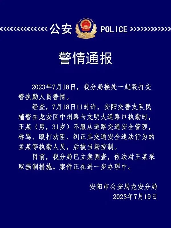 安陽警方通報“執(zhí)勤交警被當街毆打”:對涉事人采取強制措施 經(jīng)查,7月18日11時許,安陽交警支隊民輔警在龍安區(qū)中州......