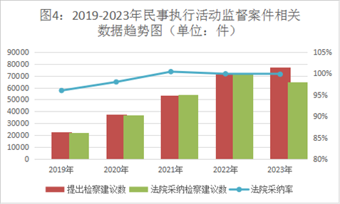 2023年,全國(guó)檢察機(jī)關(guān)共受理民事審判活動(dòng)監(jiān)督案件6.94萬(wàn)件,同期審結(jié)6.96萬(wàn)件(含積存)。提出檢察建議6.47萬(wàn)件,同比上升5.1%,占審結(jié)案件數(shù)的93%,同比增加4.2個(gè)百分點(diǎn)。對(duì)提出的檢察建議,法院同期采納6.46萬(wàn)件,檢察建議采納率達(dá)99%。一些地區(qū)通過(guò)開(kāi)展專(zhuān)項(xiàng)監(jiān)督,加強(qiáng)辦案力度,提高辦案效果,推動(dòng)民事審判活動(dòng)監(jiān)督向深層次違法監(jiān)督轉(zhuǎn)變。