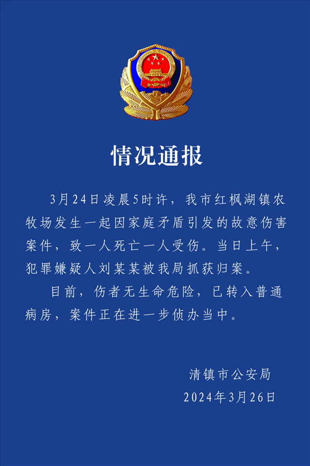 央視網(wǎng)消息:據(jù)貴州清鎮(zhèn)市公安局,3月24日凌晨5時(shí)許,清鎮(zhèn)市紅楓湖鎮(zhèn)農(nóng)牧場(chǎng)發(fā)生一起因家庭矛盾引發(fā)的故意傷害案件,致一人死亡一人受傷。