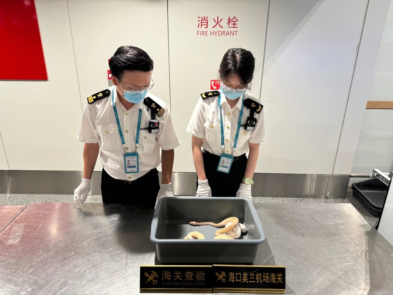 央視網(wǎng)消息:據(jù)“海關(guān)發(fā)布”公眾號消息,近日,??诤jP(guān)所屬海口美蘭機(jī)場海關(guān)在監(jiān)管入境客運(yùn)航班時,現(xiàn)場關(guān)員通過先期機(jī)檢發(fā)現(xiàn)1件托運(yùn)行李圖像存在異常。攜帶該件行李的旅客通關(guān)時選擇無申報(bào)通道,未向海關(guān)申報(bào)任何物品。經(jīng)現(xiàn)場關(guān)員開箱查驗(yàn),在其行李物品內(nèi)查獲4個裝有活物的白色布袋,拆開后發(fā)現(xiàn)每只布袋中均包裹有活體蛇類1條,共計(jì)4條。經(jīng)鑒定,這4條活體蛇為球蟒,屬于《瀕危野生動植物種國際貿(mào)易公約》(CITES)附錄Ⅱ列明物種。