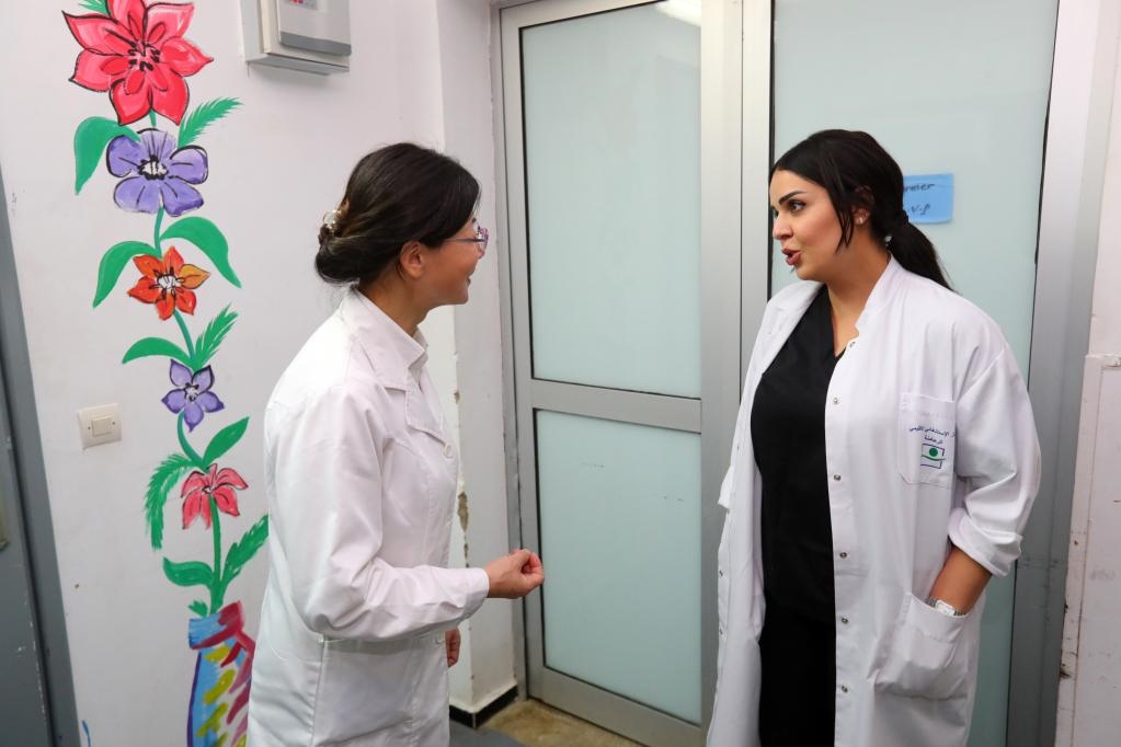 2023年2月26日,在位于摩洛哥本杰里爾的一家醫(yī)療中心,摩洛哥婦產醫(yī)生伊曼(右)和張茜在手術室外交談。新華社記者隋先凱攝