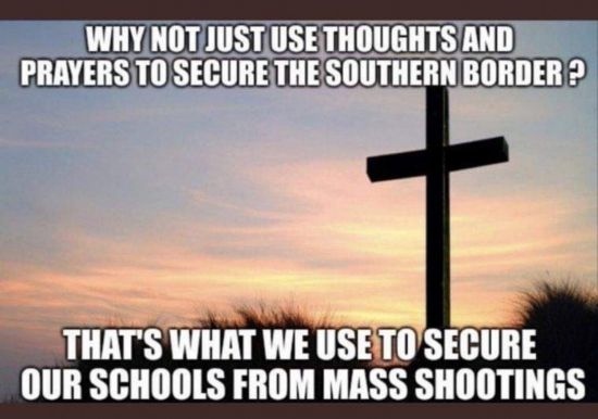 這幅漫畫則諷刺說:“為什么我們不只靠祈禱來阻止非法移民進入美國?我們可是只靠祈禱來保護學(xué)校不發(fā)生大規(guī)模槍擊。”