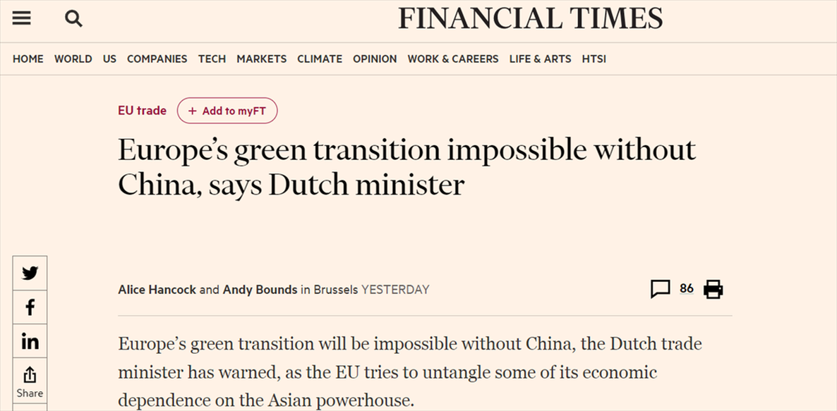 英國《金融時報》28日報道稱,荷蘭外貿(mào)與發(fā)展合作大臣施賴納馬赫爾警告稱,沒有中國,歐洲的綠色轉(zhuǎn)型將無法實現(xiàn)。