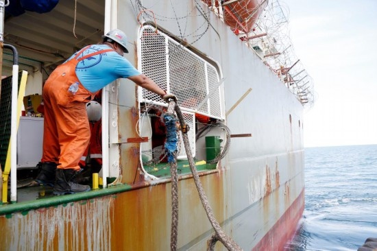 5月30日,聯(lián)合國(guó)工程船的船員在該船抵達(dá)也門(mén)紅海港口荷臺(tái)達(dá)附近海域后固定船只。新華社發(fā)(默罕默德攝)
