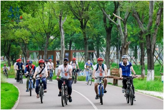 直播記錄下了外媒記者們騎行打卡世界規(guī)模最大的綠道系統(tǒng)——天府綠道核心“一軸”錦江綠道的全程:從鳥(niǎo)語(yǔ)花香的桂溪生態(tài)公園出發(fā),在綠樹(shù)掩映的婚姻登記所簽訂“城市婚書(shū)”,在亞洲最大單體建筑新世紀(jì)環(huán)球中心南側(cè)濕地學(xué)習(xí)四川話,在錦城湖4號(hào)湖畔撞線……
