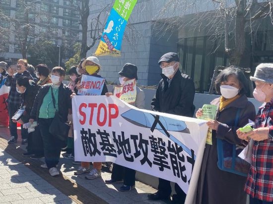2023年2月28日,在日本東京,日本民眾舉著標(biāo)語(yǔ)牌抗議日本眾議院通過(guò)高額的防衛(wèi)費(fèi)預(yù)算案。新華社記者郭丹攝