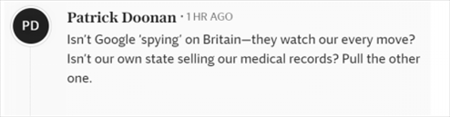 還有網(wǎng)友提到美國互聯(lián)網(wǎng)巨頭公司,“谷歌不是在‘監(jiān)視’英國嗎——他們監(jiān)視著我們的一舉一動(dòng)?我們自己的地區(qū)不是在賣我們的醫(yī)療記錄嗎?”