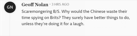 “危言聳聽。中國人為什么要浪費(fèi)時(shí)間監(jiān)視英國人?他們肯定有更好的事情要做,除非他們這么做是為了搞笑?!?/p>