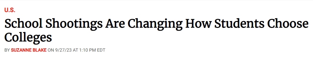 也是由于校園槍擊事件的日漸頻繁,美國(guó)學(xué)生選擇大學(xué)的方式也隨之發(fā)生變化。據(jù)美國(guó)《新聞周刊》(News Week)網(wǎng)站27日?qǐng)?bào)道,僅在2023年,全美就發(fā)生了53起校園槍擊事件?!皹屩П┝n案”(Gun Violence Archive)的數(shù)據(jù)顯示,各類與槍支有關(guān)的死亡總共有3萬多起。