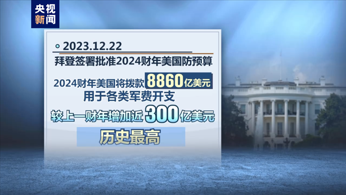 一方面美國政府財政長期入不敷出,一方面美國軍費開支也在節(jié)節(jié)攀升。2023年12月22日,美國總統(tǒng)拜登簽署批準(zhǔn)了2024財年美國國防預(yù)算。根據(jù)預(yù)算,2024財年美國將撥款8860億美元用于各類軍費開支,較上一財年增加近300億美元,該數(shù)額為歷史最高。