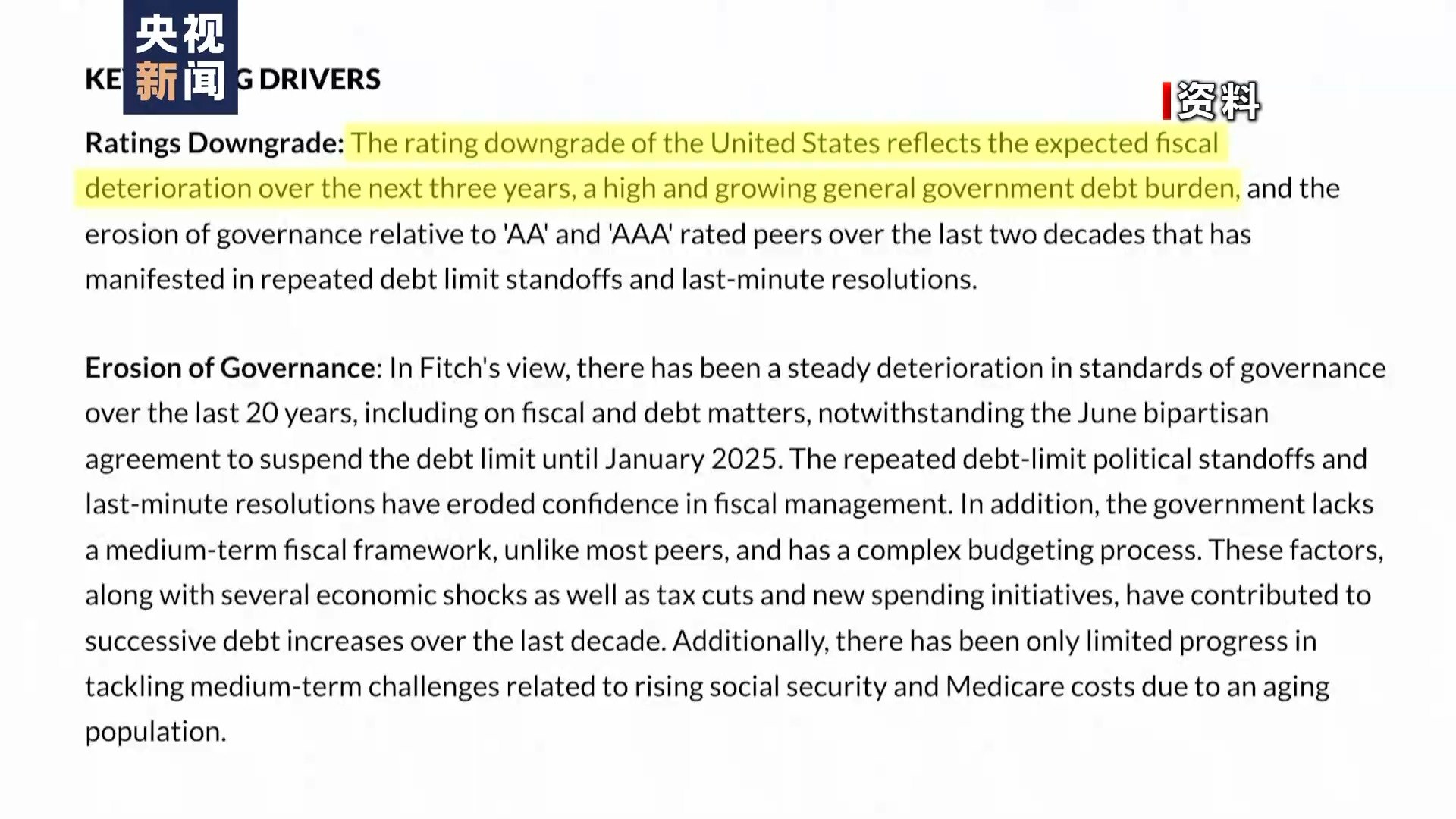 到了2023年8月1日,國際評級機構(gòu)惠譽將美國長期外幣發(fā)行人違約評級從AAA下調(diào)至AA+。惠譽當(dāng)天發(fā)表聲明說,下調(diào)美國信用評級主要由于美國政府債務(wù)負(fù)擔(dān)居高不下且不斷加重,未來3年財政狀況預(yù)計將持續(xù)惡化。