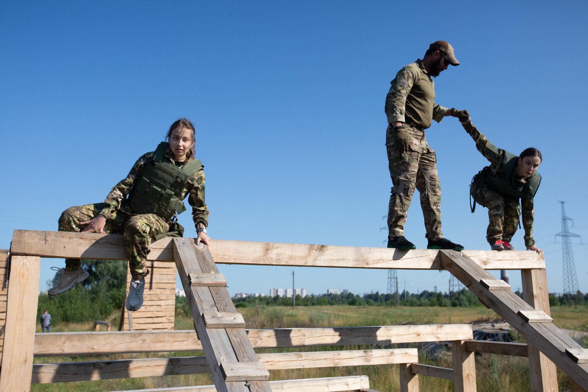 當(dāng)?shù)貢r(shí)間2023年7月15日,扎波羅熱地區(qū),烏克蘭女兵在不同的戰(zhàn)斗場景中進(jìn)行訓(xùn)練。