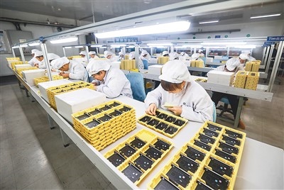 山東省榮成市港西鎮(zhèn)一家外資電子制造企業(yè)的工人們在電子智能設(shè)備生產(chǎn)線上忙碌著,趕制出口國外的訂單產(chǎn)品。