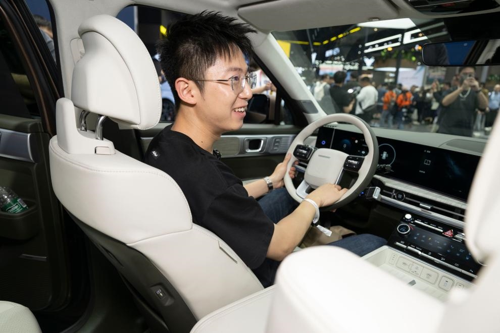 ?4月4日,在巴西圣保羅舉行的巴西防務(wù)展上,參觀者體驗(yàn)一輛經(jīng)過防彈加固的比亞迪海豹電動汽車。新華社記者王天聰攝