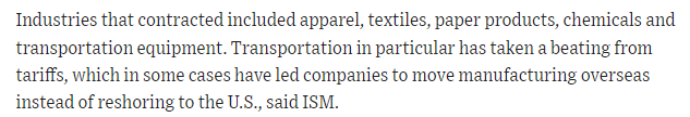 文章指出,美國制造業(yè)活動萎縮的行業(yè)主要包括服裝、紡織品、紙制品、化工產(chǎn)品和運輸業(yè)。文章表示,雖然當前美國工廠產(chǎn)量有所增加,但未售出的庫存卻急劇增加。需求增長放緩,這在出口市場體現(xiàn)尤為明顯,而受關稅影響,出口市場的前景更加暗淡。