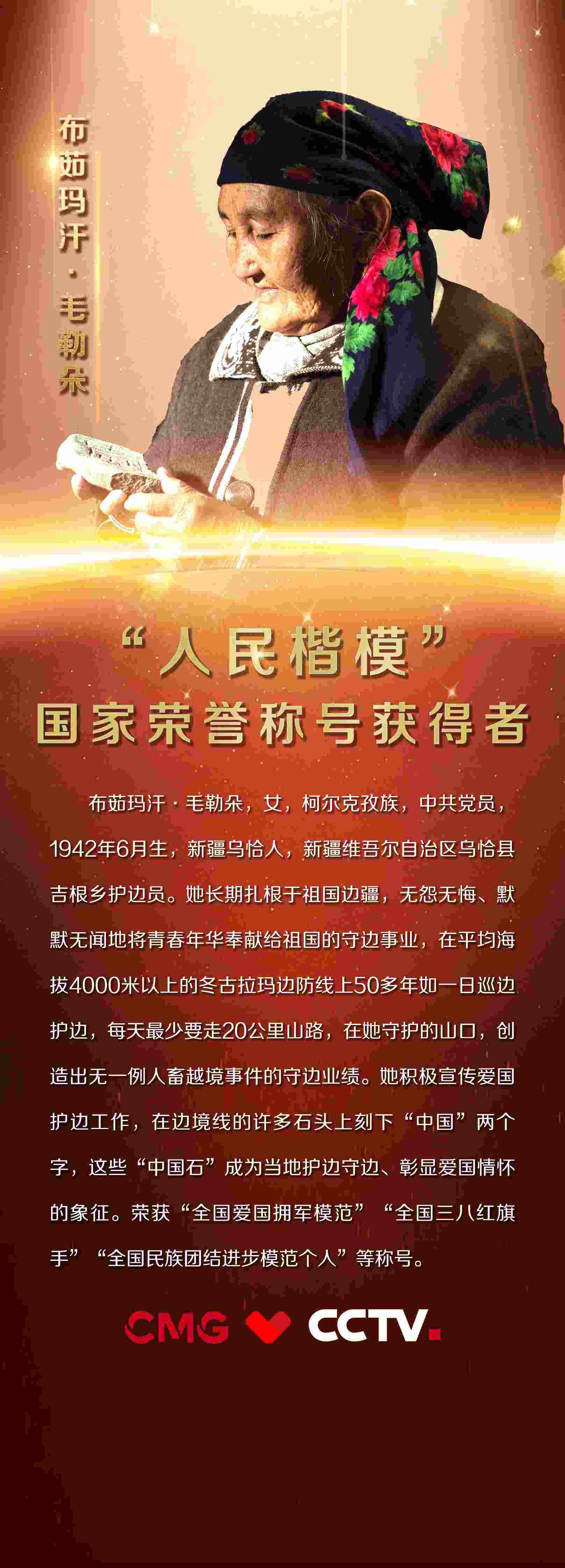 布茹瑪汗·毛勒朵,女,柯爾克孜族,中共黨員,1942年6月生,新疆烏恰人,新疆維吾爾自治區(qū)烏恰縣吉根鄉(xiāng)護(hù)邊員。她長(zhǎng)期扎根于祖國(guó)邊疆,無怨無悔、默默無聞地將青春年華奉獻(xiàn)給祖國(guó)的守邊事業(yè),在平均海拔4000米以上的冬古拉瑪邊防線上50多年如一日巡邊護(hù)邊,每天最少要走20公里山路,在她守護(hù)的山口,創(chuàng)造出無一例人畜越境事件的守邊業(yè)績(jī)。她積極宣傳愛國(guó)護(hù)邊工作,在邊境線的許多石頭上刻下“中國(guó)”兩個(gè)字,這些“中國(guó)石”成為當(dāng)?shù)刈o(hù)邊守邊、彰顯愛國(guó)情懷的象征。榮獲“全國(guó)愛國(guó)擁軍模范”“全國(guó)三八紅旗手”“全國(guó)民族團(tuán)結(jié)進(jìn)步模范個(gè)人”等稱號(hào)。