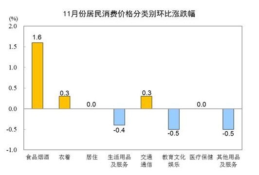 11月份,全國居民消費價格環(huán)比上漲0.4%。其中,城市上漲0.3%,農村上漲0.6%;食品價格上漲2.4%,非食品價格持平;消費品價格上漲0.9%,服務價格下降0.3%。