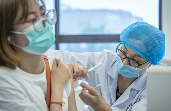 8月16日,江蘇句容,市民雨中排隊(duì)后接種新冠疫苗。人民視覺(jué)供圖