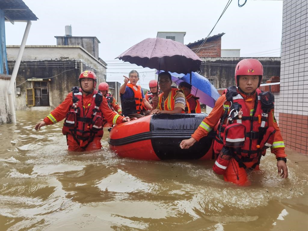 6月21日,在廣東韶關市曲江區(qū)樟市鎮(zhèn)鐵廠村,消防救援人員轉(zhuǎn)移被困群眾。(新華社發(fā)周思濤攝)