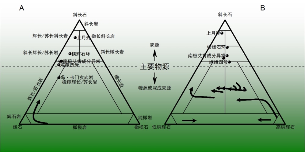 以往對南極-艾肯盆地物質(zhì)成分的研究大多只注重鎂鐵質(zhì)礦物,由于這一地區(qū)的鎂鐵質(zhì)異常特征,甚至引發(fā)了有關(guān)月幔是橄欖巖還是輝石巖的爭論。雖然根據(jù)月球巖漿洋假說,橄欖石和輝石是月幔的主要礦物,但是月殼形成之后的深成巖漿侵入作用同樣能夠在月殼中形成富集橄欖石或輝石的巖石,因此富集橄欖石或輝石并不能作為源自月幔的證據(jù)。迄今人類還沒有獲取南極-艾肯盆地的樣品返回地球,無法獲知其微量元素和同位素特征,通過遙感或原位探測可獲得的物質(zhì)成分信息中,斜長石含量也是區(qū)分殼源和幔源巖石的關(guān)鍵指標。