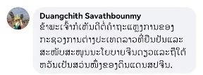 老撾黨中央機關(guān)報前總編輯、社長端吉·薩瓦本彌(Duangchith Savathbounmy)留言:“認(rèn)同我的祖國對臺灣問題的表態(tài),支持一個中國原則,臺灣是中國不可分割的一部分。”