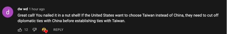 網(wǎng)友dw wd:“精彩的一期視頻!你簡潔而清晰地呈現(xiàn)了內(nèi)容,如果美國真的想選擇與臺灣建立所謂的‘外交關(guān)系’,他們首先需要與中國斷交?!?/p>