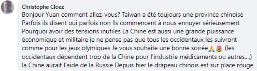 法語網(wǎng)友克羅茲:“臺灣始終是中國的一個省,美國人一會兒承認(rèn)一會兒又不承認(rèn),現(xiàn)在他們又開始搗亂。為什么要制造這種毫無意義的緊張氣氛呢?中國是一個經(jīng)濟和軍事大國,我不認(rèn)為西方會跟著美國走,就像之前的奧運會一樣,西方國家太依賴于中國工業(yè)了。俄羅斯應(yīng)該是支持中國的吧,昨天紅場上方都飄著中國國旗?!?/p>
