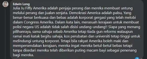 馬來西亞網(wǎng)友Edwin Long留言:“美國就是戰(zhàn)爭販子,他們通過戰(zhàn)爭和販賣武器獲利。美國的民主只是假象,真正享有權(quán)力和自由的是在幕后主導(dǎo)國會的大企業(yè)。換句話說,官商勾結(jié)在美國的法律上是被允許的!無論誰贏得選舉,一樣不會禁槍,醫(yī)療和教育成本還是不會下降,因為要維護大企業(yè)的利益。但是他們的人民覺得他們能罵政府就是自由的,全然沒有意識到這不過是安撫奶嘴罷了?!?/p>