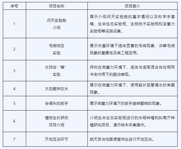 本次太空授課活動(dòng)將繼續(xù)采取天地互動(dòng)方式進(jìn)行,3名航天員將在軌介紹展示中國空間站問天實(shí)驗(yàn)艙工作生活場景,演示微重力環(huán)境下毛細(xì)效應(yīng)實(shí)驗(yàn)、水球變“懶”實(shí)驗(yàn)、太空趣味飲水、會(huì)調(diào)頭的扳手以及植物生長研究項(xiàng)目介紹,并與地面課堂進(jìn)行互動(dòng)交流(授課內(nèi)容介紹附后),旨在傳播普及載人航天知識,激發(fā)廣大青少年對科學(xué)的興趣。