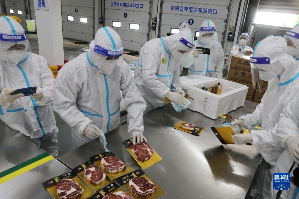 記者在現(xiàn)場看到,當運輸進口冷鏈食品展品的車輛到達后,工作人員馬上對司機進行健康碼核驗和體溫檢測,并對車輛進行消毒。裝卸過程中,司機實行“非必要不下車”。貨物入庫時,在完成外包裝消毒后,工作人員將展品拆除外包裝,對內(nèi)里的小包裝進行消毒、核酸檢測,再重新裝箱、貼標簽、放入暫存庫,之后再轉(zhuǎn)入合格儲存庫。