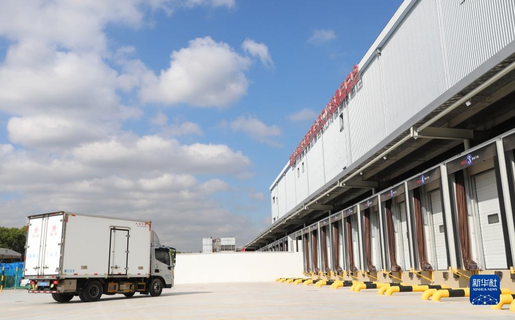 10月20日,裝載第一批進口冷鏈食品展品的卡車駛入總倉卸貨區(qū)域。新華社記者 方喆攝
