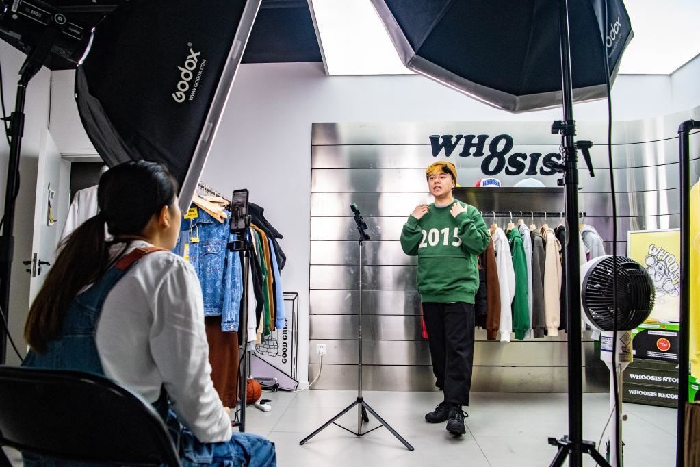 在重慶市渝中區(qū)由工業(yè)遺址改造成的“一廠影視園”一家國潮品牌公司內,創(chuàng)業(yè)者通過手機直播銷售商品(2022年9月27日攝)。新華社記者唐奕攝