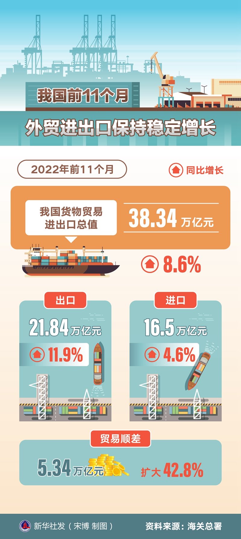 新華社北京12月7日電(記者鄒多為)海關(guān)總署7日發(fā)布數(shù)據(jù):今年前11個(gè)月,我國(guó)貨物貿(mào)易進(jìn)出口總值38.34萬(wàn)億元,同比增長(zhǎng)8.6%。其中,出口21.84萬(wàn)億元,增長(zhǎng)11.9%;進(jìn)口16.5萬(wàn)億元,增長(zhǎng)4.6%;貿(mào)易順差5.34萬(wàn)億元,擴(kuò)大42.8%。