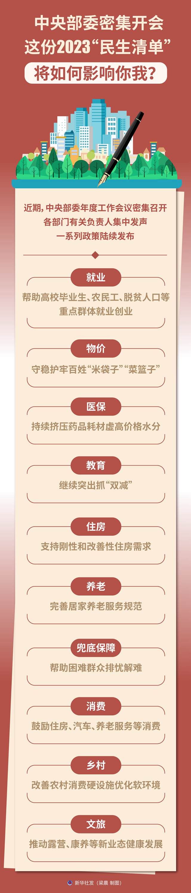 近期,中央部委年度工作會(huì)議密集召開,各部門有關(guān)負(fù)責(zé)人集中發(fā)聲,一系列政策陸續(xù)發(fā)布?!靶氯A視點(diǎn)”記者梳理了多個(gè)領(lǐng)域2023年聚焦民生關(guān)切的重要舉措。