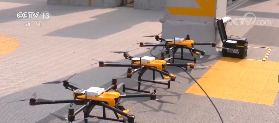 中午11點(diǎn),在深圳一家商場頂層的平臺上,一架架無人機(jī)整齊停放在“停機(jī)坪”,工作人員將傳送帶上的外賣掃碼、裝箱,再掛上無人機(jī)就準(zhǔn)備起飛。在幾公里外的目的地,有智能空投柜等待接收,降落后顧客憑取件碼取餐,方便安全。