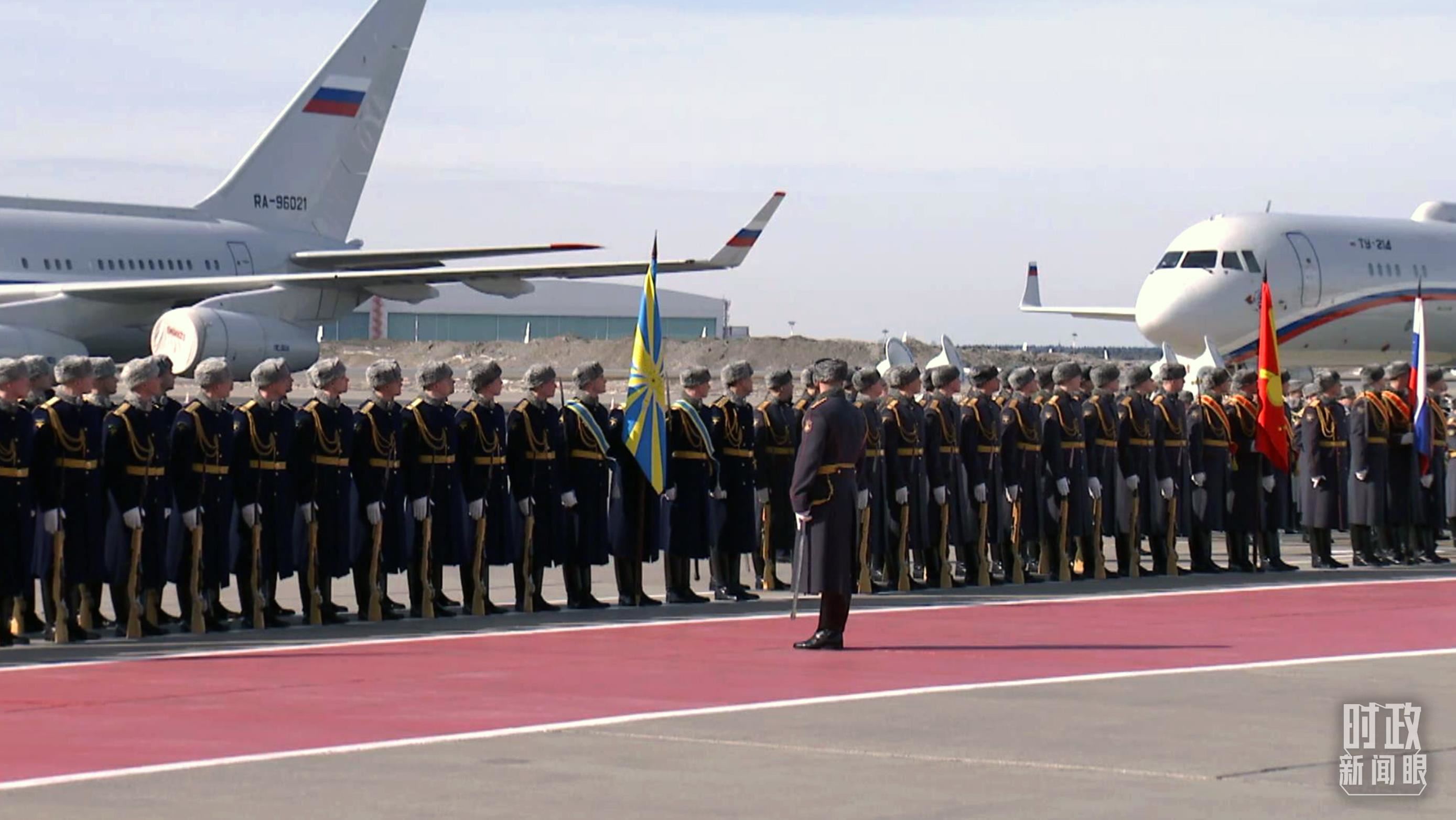 俄方在機(jī)場舉行隆重迎賓儀式。軍樂團(tuán)奏中俄兩國國歌。習(xí)主席檢閱俄羅斯三軍儀仗隊(duì)并觀看分列式。