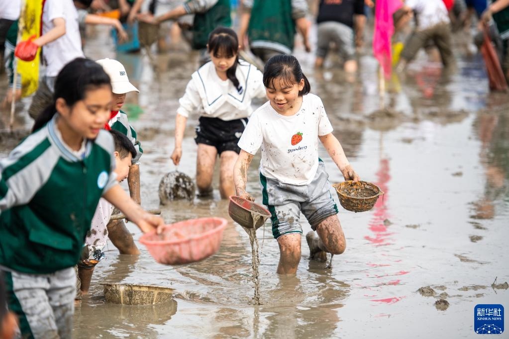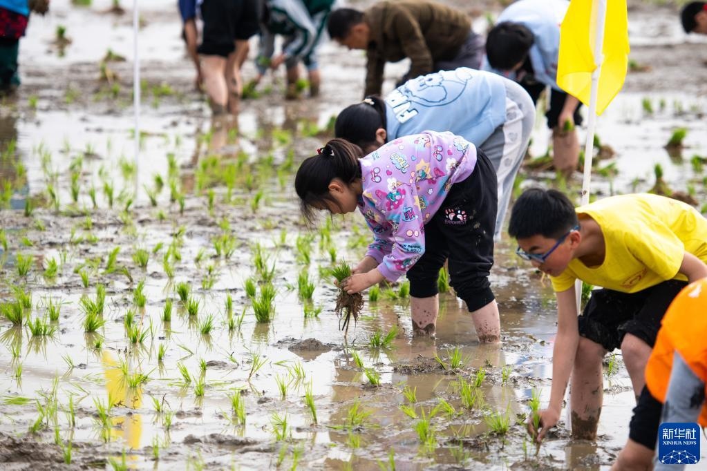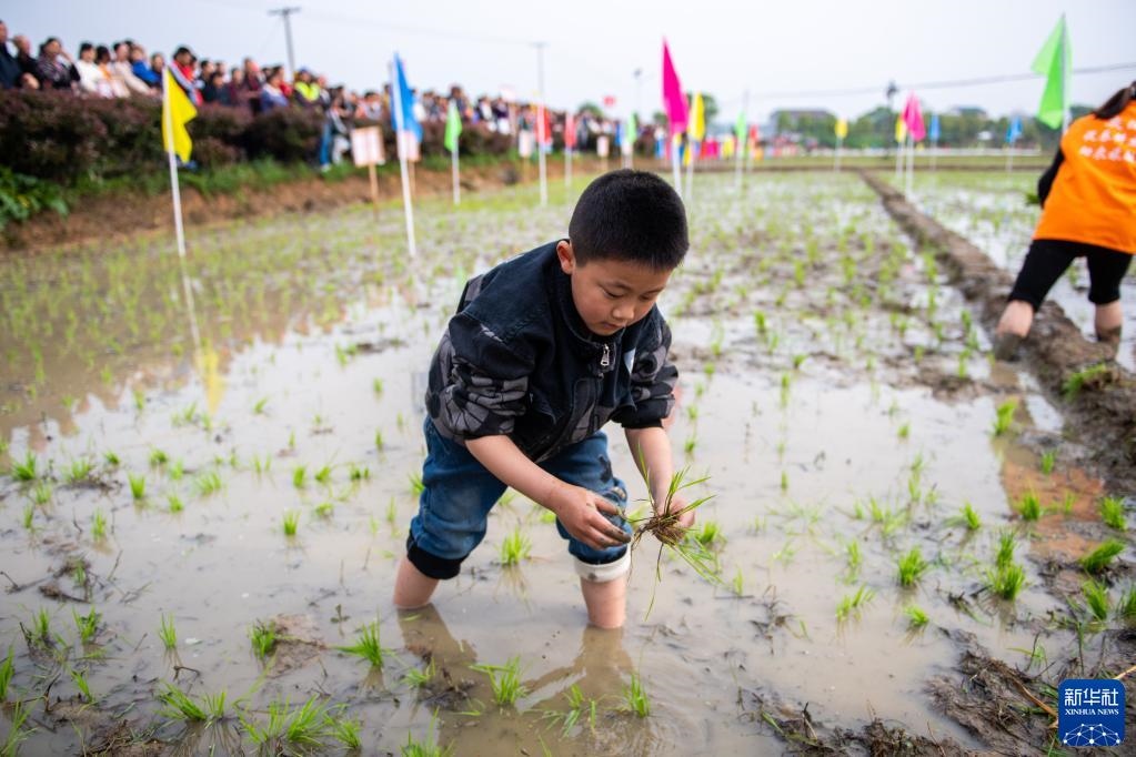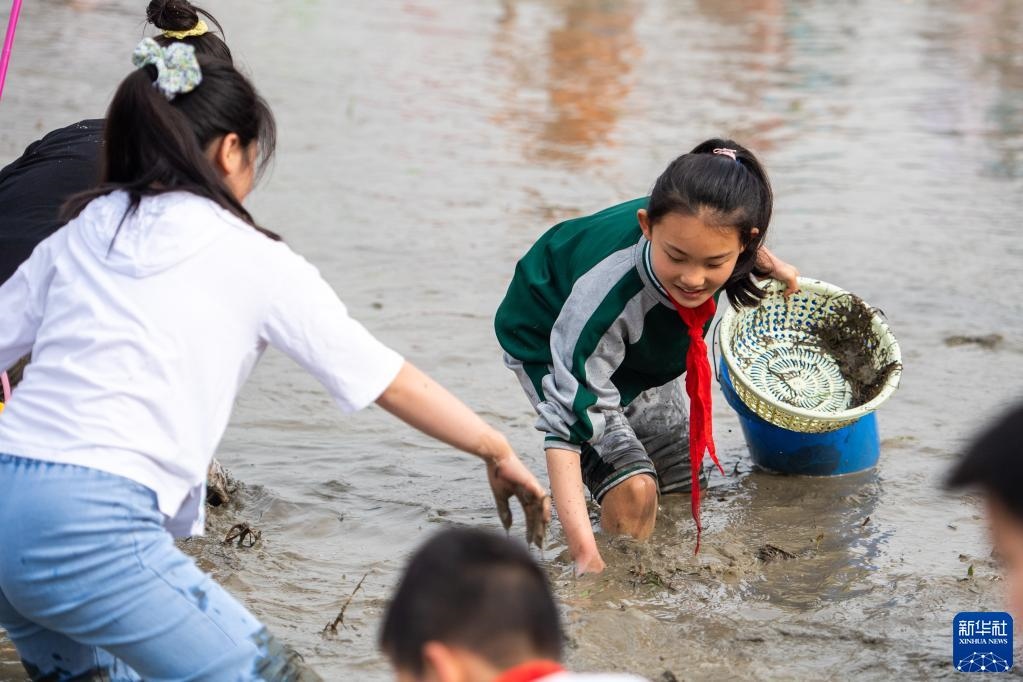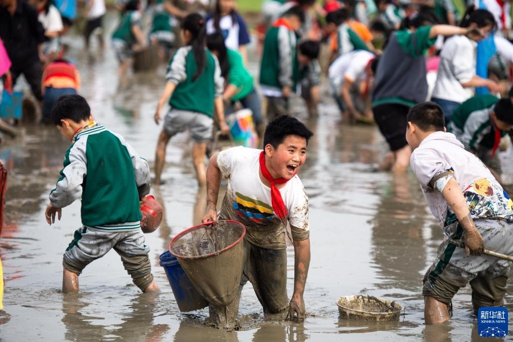 當日,在湖南省長沙市寧鄉(xiāng)市灰湯鎮(zhèn)花果山村舉行的農(nóng)耕民俗文化節(jié)學生研學活動中,孩子們通過開展稻田插秧、捉泥鰍等“農(nóng)趣” 比賽,走進田間地頭,感受勞動帶來的艱辛與快樂。新華社記者 陳思汗 攝