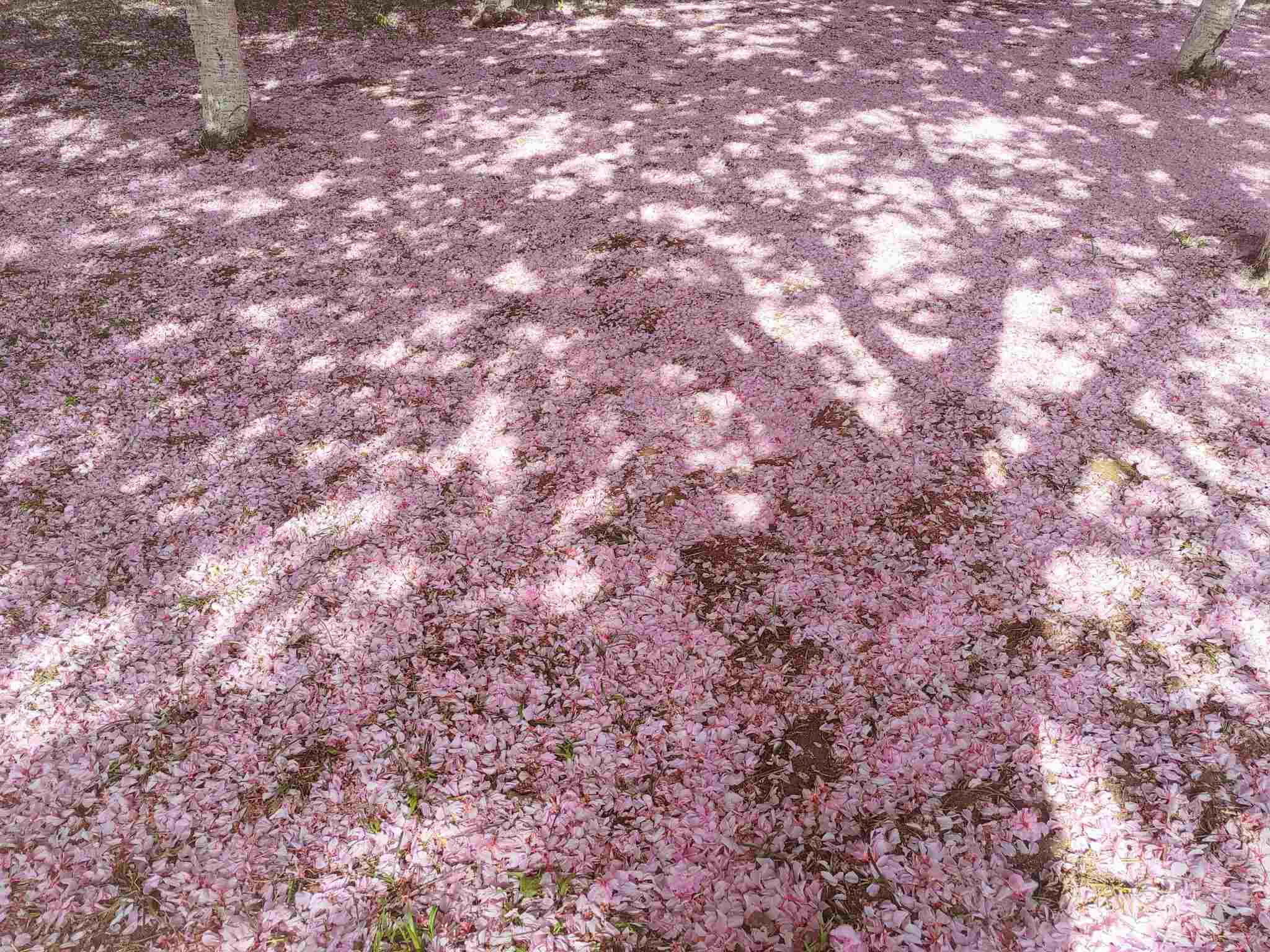 2023年4月29日,青島中山公園,經歷風雨之后,櫻花樹下落了厚厚一層花瓣。視覺中國