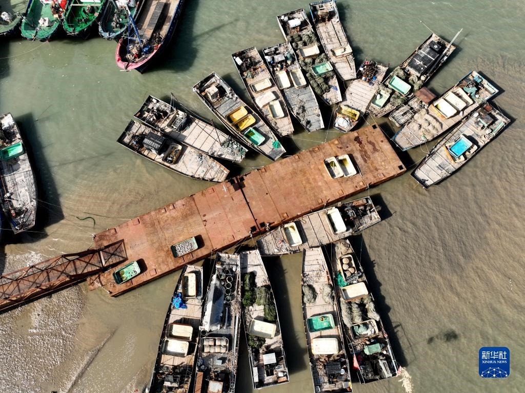 4月30日,在江蘇省連云港市贛榆區(qū)青口漁港碼頭,漁民在卸載漁具,為即將到來的伏季休漁做準(zhǔn)備(無人機(jī)照片)。