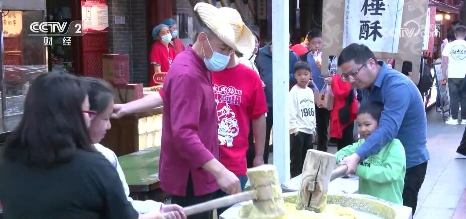 在這條街區(qū),你還可以找到各種陜西特色美食的身影。這種色澤金黃的美食叫陜北小米酥,現(xiàn)場制作,入口酥脆。這個“五一”假期,很多游客一路逛一路吃,走的時候還會給家里人帶上幾盒。