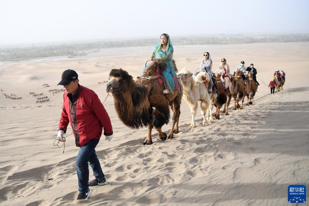 曹文華和他的駝隊載著游客行走在鳴沙山月牙泉景區(qū)的駝道上(4月24日攝)。