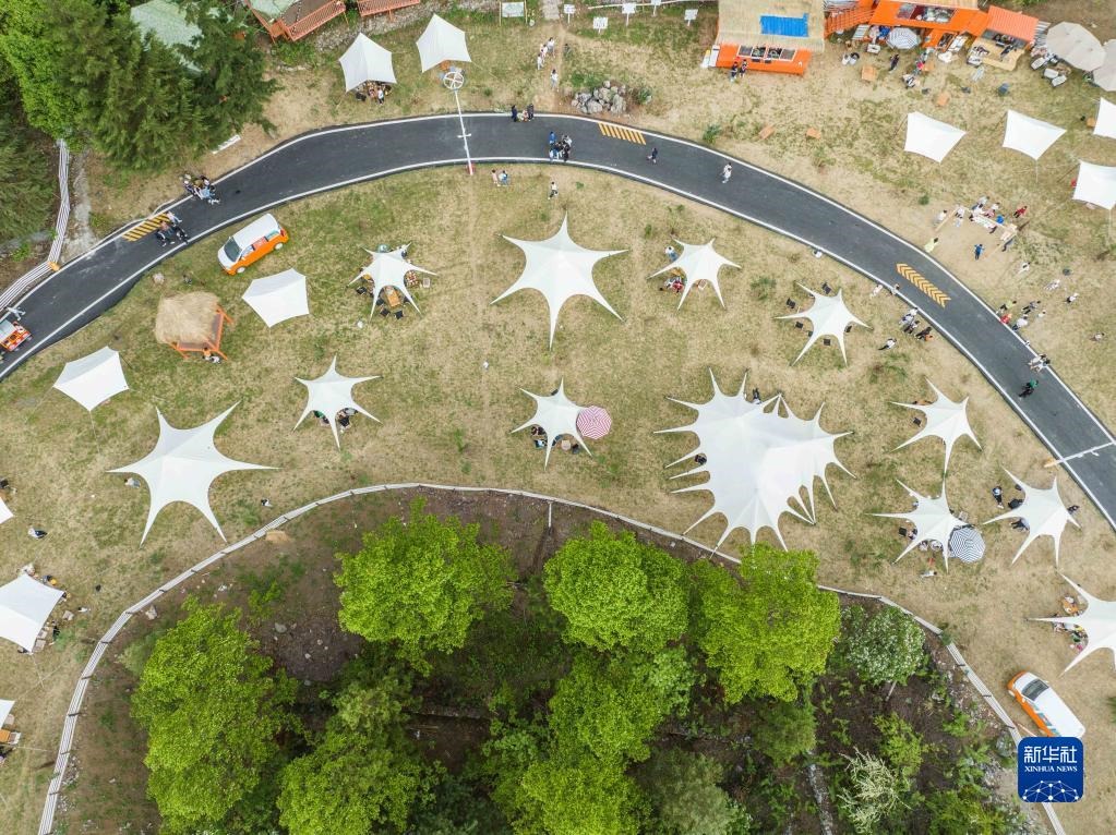 5月1日,游客在貴州省畢節(jié)市赫章縣硐上村游玩(無人機(jī)照片)。
