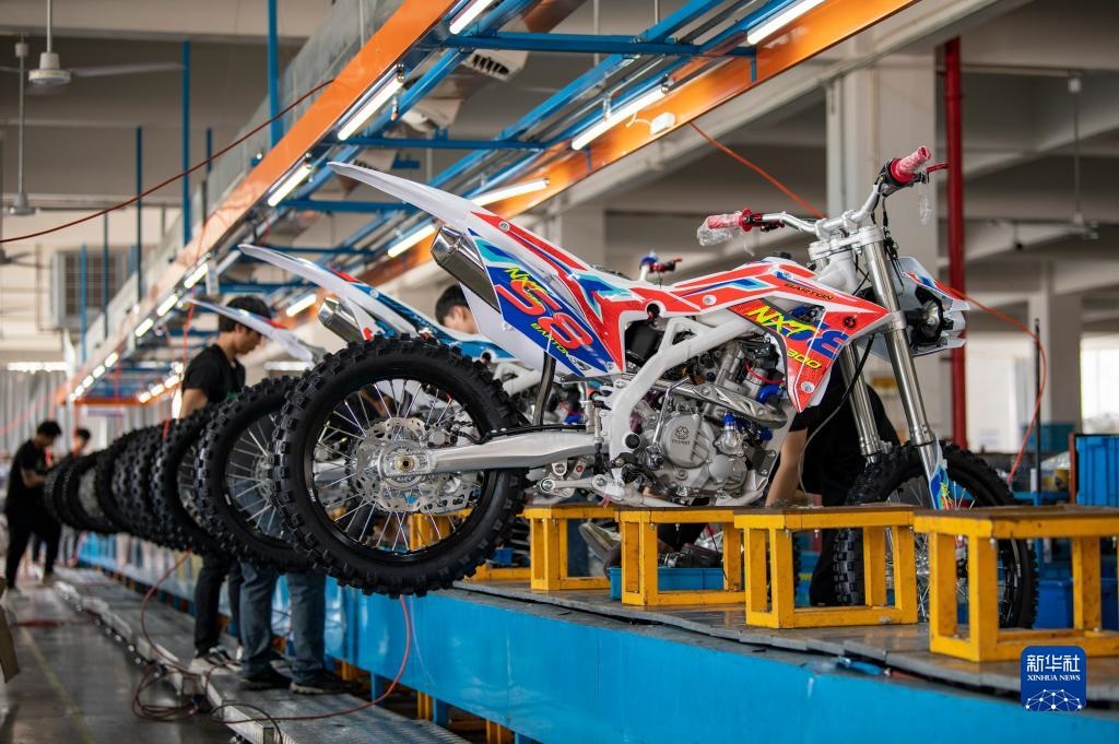 5月4日,在浙江省金華市武義縣桐琴鎮(zhèn)五金工業(yè)區(qū)的一家企業(yè),工人趕制準備銷往海外的越野摩托車。